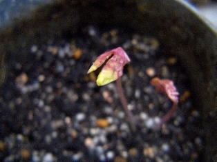 あ、コレ、この前慌てて蒔いた、朝顔の芽です。まさかの、朝顔にあるまじき姿…。