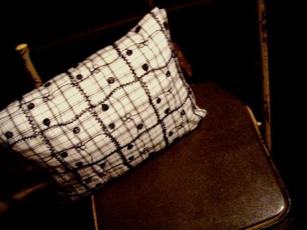 通常のクッションサイズよりも一回り小さいこのクッション。布も個性的な「おあと屋」のちょっと高めの布だったので、会社に持っていくと、結構好評。